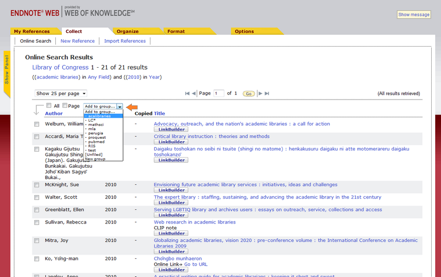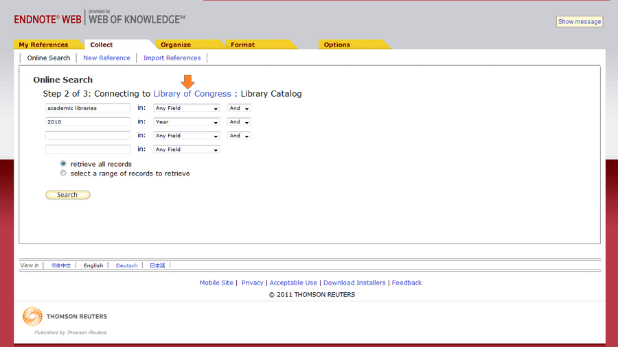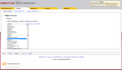 EndNote Web offre la possibilità di effettuare ricerche dirette da centinaia di cataloghi e basi dati. Per farlo si può accedere dalla funzione Collect > Online Search della barra di navigazione.