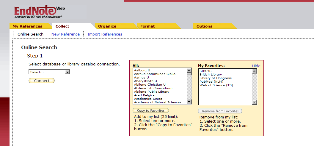 E’ possibile selezionare le fonti dalla lista e aggiungerle a My Favourite. Da questa lista personalizzata è possibile scegliere il catalogo e/o la base dati a cui connettersi direttamente ed effettuare una ricerca senza uscire da EndNoteWeb.