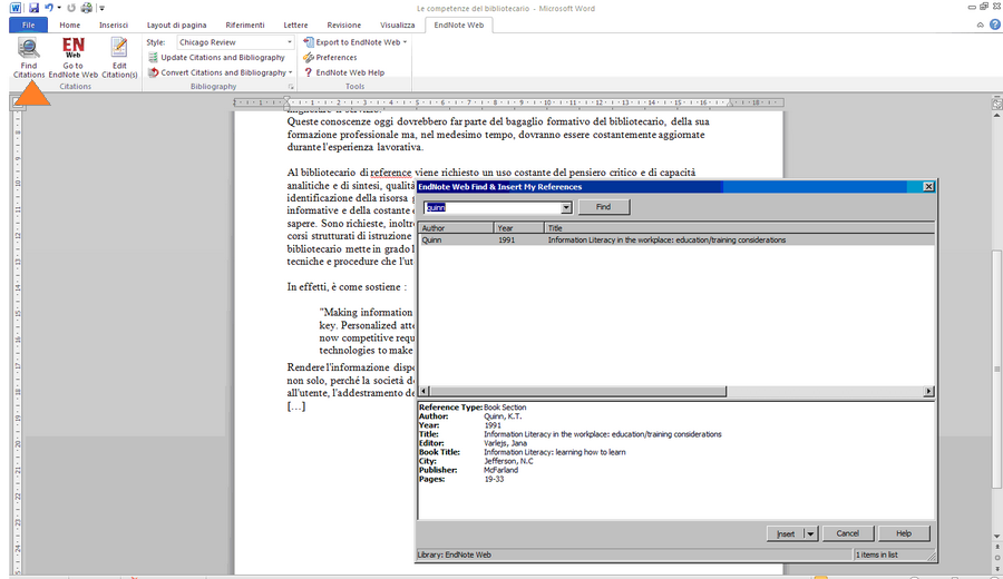 Find Citations dalla barra di EndNote Web. Quindi eseguire una ricerca e selezionare la citazione.