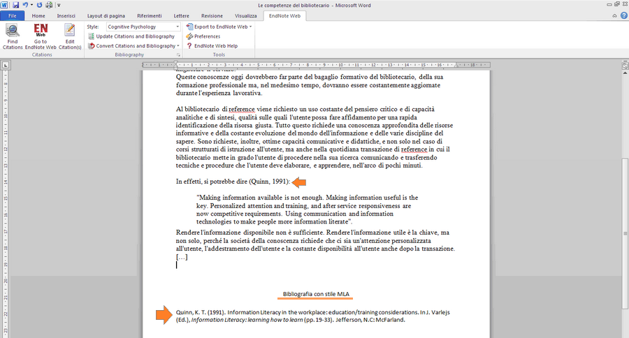 Inserisci> Nota a pič pagina quindi posizionarsi con il cursore e selezionare la citazione dalla Barra degli Strumenti EndNote Web.